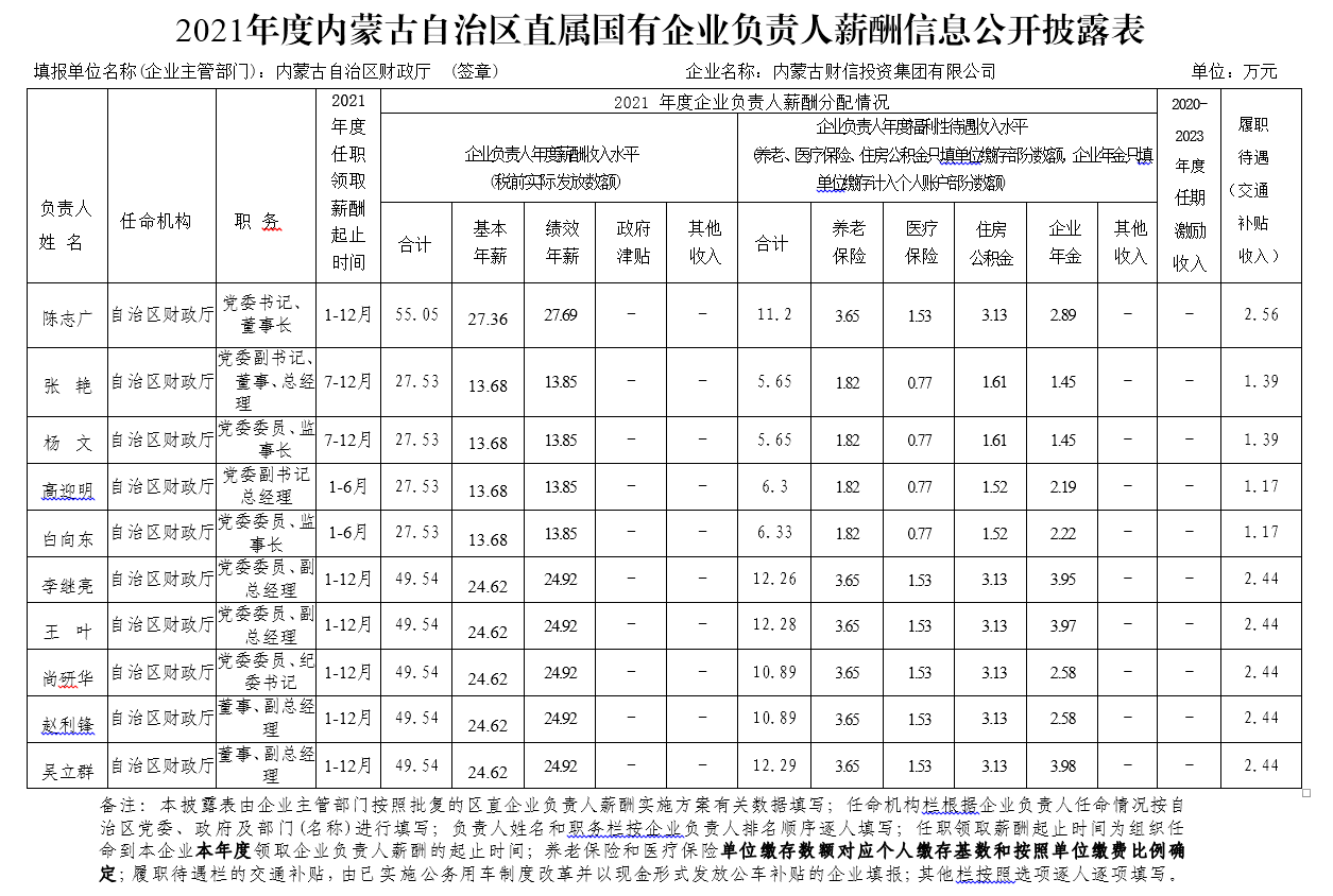 2021年度內(nèi)蒙古自治區(qū)直屬國有企業(yè)負責人薪酬信息公開披露表