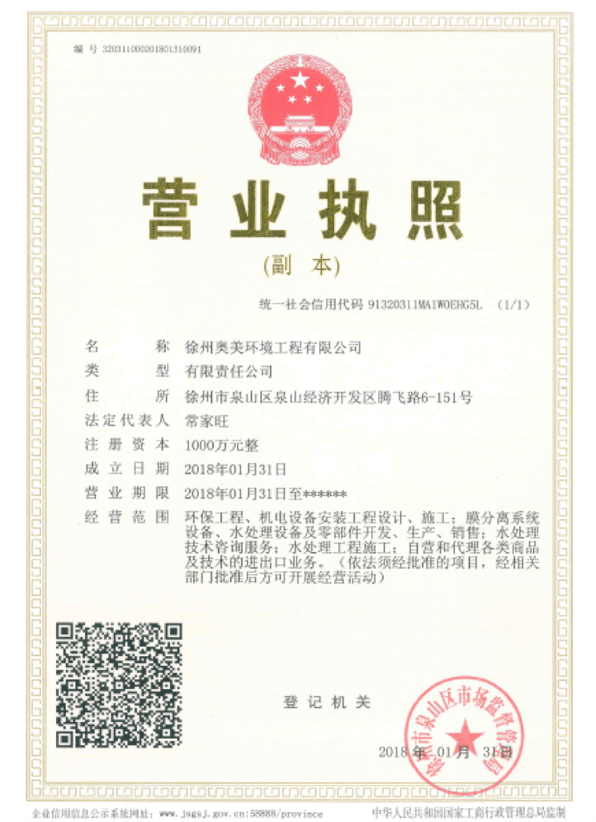 為更好的開(kāi)拓公司業(yè)務(wù),優(yōu)化公司的戰(zhàn)略布局,增強(qiáng)公司盈利能力,進(jìn)一步提高公司綜合競(jìng)爭(zhēng)力,公司與徐州泉山經(jīng)濟(jì)開(kāi)發(fā)區(qū)投資發(fā)展有限公司聯(lián)合成立徐州奧美環(huán)境工程有限公司。近日,該控股子公司已完成工商注冊(cè)登記手續(xù),并取得徐州市泉山區(qū)市場(chǎng)監(jiān)管局核發(fā)的《營(yíng)業(yè)執(zhí)照》,2018奧美環(huán)境進(jìn)入開(kāi)枝散葉階段!