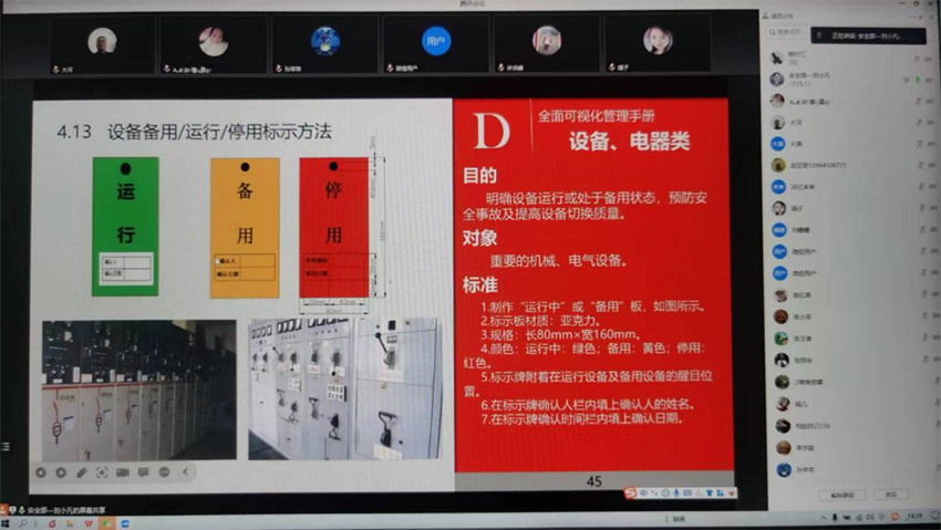 為切實做好常態(tài)化疫情防控工作,確保公司各項工作有序開展,11月25日下午14:00,我司通過“騰訊會議”召開2022年6S安全生產(chǎn)管理工作線上會議,安排公司下一步標準化生產(chǎn)、管理的各項工作。會議由安全部劉小凡主持,公司董事長竇大河、總經(jīng)理姚付江、總監(jiān)李學勤及辦公室、車間生產(chǎn)人員參加。